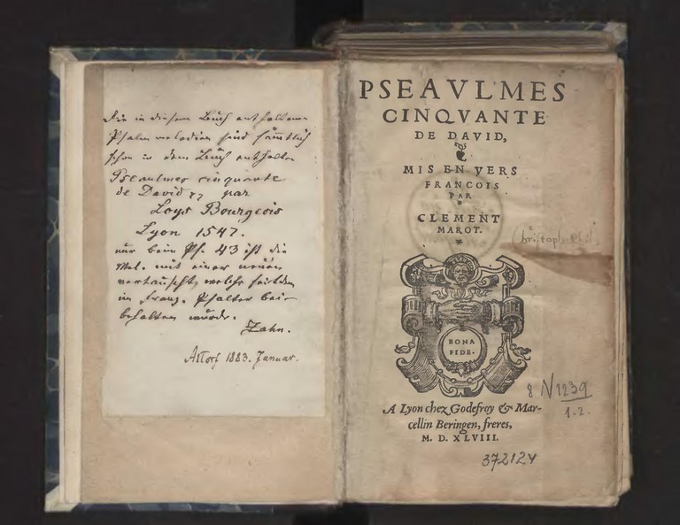 Full title: Psalmes de David, Translatez de plusieurs Autheurs, & principallement de Cle. Marot..Veu, recongneu et corrigé par les theologiens, nommeement par M.F. Pierre Alexandre, concionateur ordinaire de la Royne de Hongrie.… (Antwerp, Antoine des Gois, 1541) with 30 Psalm paraphrases by Marot. This collection contains 45 Psalm paraphrases, among which the 30 by Marot already known from manuscripts. The title page suggests a more or less active role of Queen Mary of Hungary’s chaplain, Friar Pierre Alexandre, in the compilation of this edition. The fact that both Des Gois and Alexandre are known for their Evangelical sympathies gives this edition a ‘Reformed’ colour.