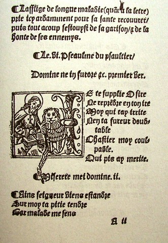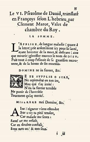 A small booklet (a plaquette) with no date or place of impression contains the first translation of Marot into the vernacular: Le VI. Pseaulme de David, qui est le premier Pseaulme des sept Pseaulmes, translate en francoys par Clement Marot Varlet de chambre du Roy nostre sire au plus pres de la verite Ebraicque.