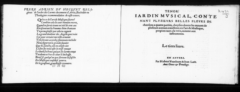Since Waelrant is quite well-known, I refer to other and easily accessible sources with info about him. He published his own Psalm settings in 'Jardin Musical' (3 volumes 1555-1556). There also other Flemish contributions to this genre (Cauléry and: psalm 51 by Clemens non Papa, the one who is famous for his 3vv settings of the 'Souterliedekens' ). The publishing firm 'Waelrant -Laet' was also responsible for the three volumes of Jean Louys' Cinquante Pseaumes also in 1555. Below the title page of the 3rd volume of the Jardin Musical.