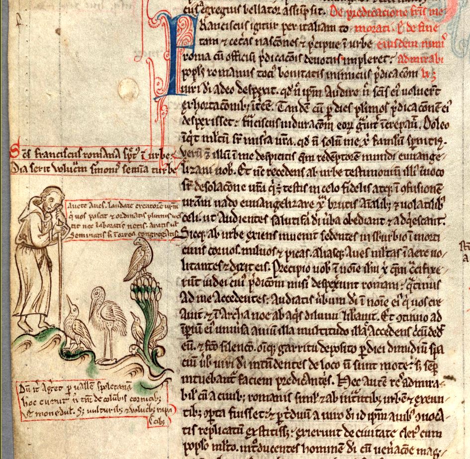 En terwijl hij de stad verliet, zag Franciscus kraaien, wouwen, eksters en ander gevogelte dat daar vliegt in het midden des hemels en dat zich voedt met aas en het afval van de stad, en hij beval die naar hem te luisteren […]. Op zijn woord verzamelde zich een hele menigte van vogels rondom hem en ze luisterden stil naar hem, de ogen gericht op de prediker. Toen dit verhaal bekend werd in de stad, kwamen de inwoners van Rome tot inkeer en smeekten Franciscus terug te keren en ook tot hen het evangelie te preken.