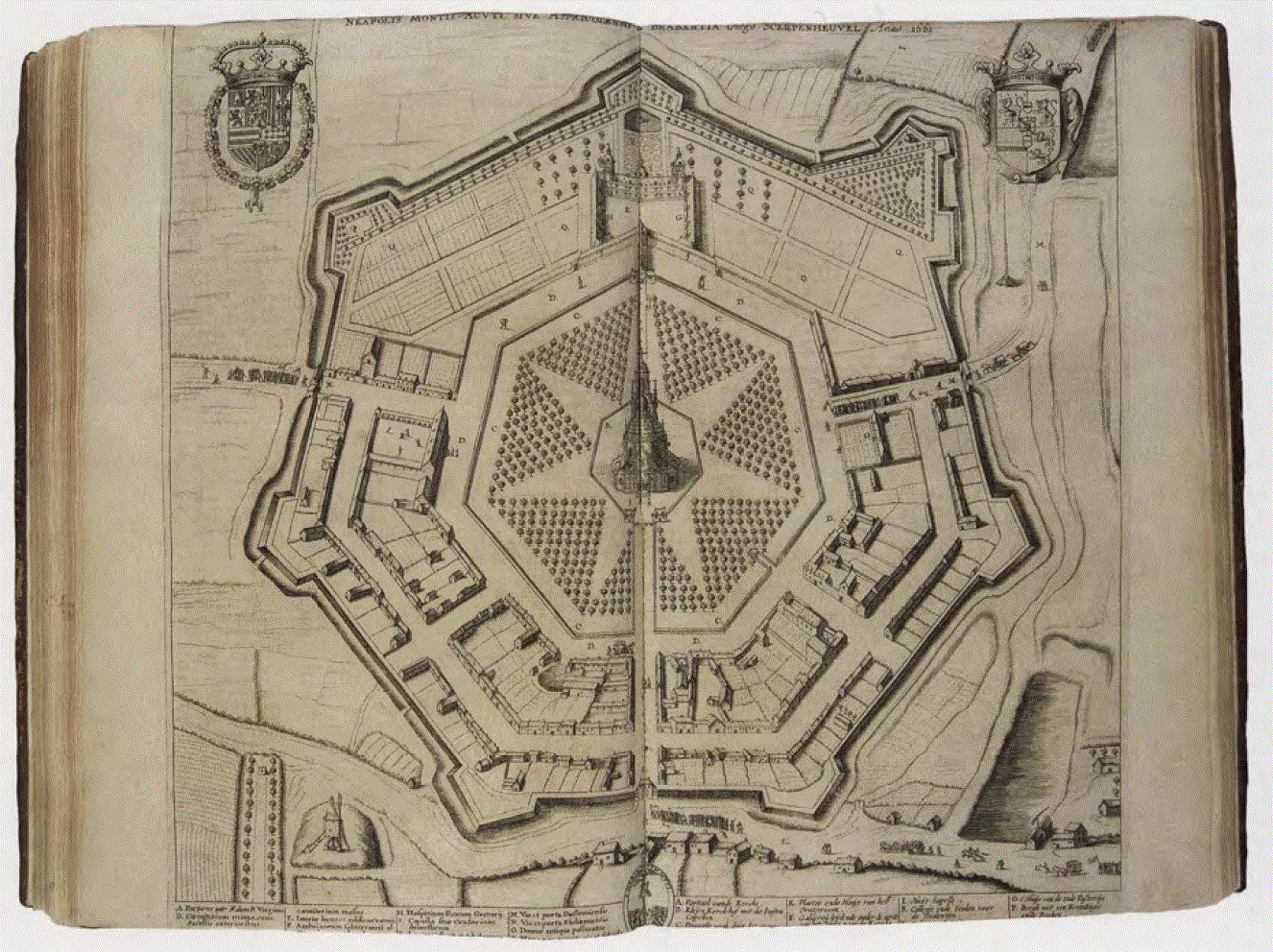 TOEGIFT: Het themanummer van Openbaar Kunstbezit in Vlaanderen’ 2005/1, dat geheel gewijd is aan de basiliek van Scherpenheuvel, heeft een interessant artikel over de symboliek van de bouw. Omdat ze zo veelzeggend is, hier een afbeelding die alles zegt. De plattegrond van Wenceslas Cobergher. De vestingstructuur is duidelijk, maar ook de tuin is aanwezig. Daaronder nog enkele foto’s genomen uit het themanummer, waarvan ik de historisch-theologische artikelen onderaan deze pagina overneem (PDF-reader).